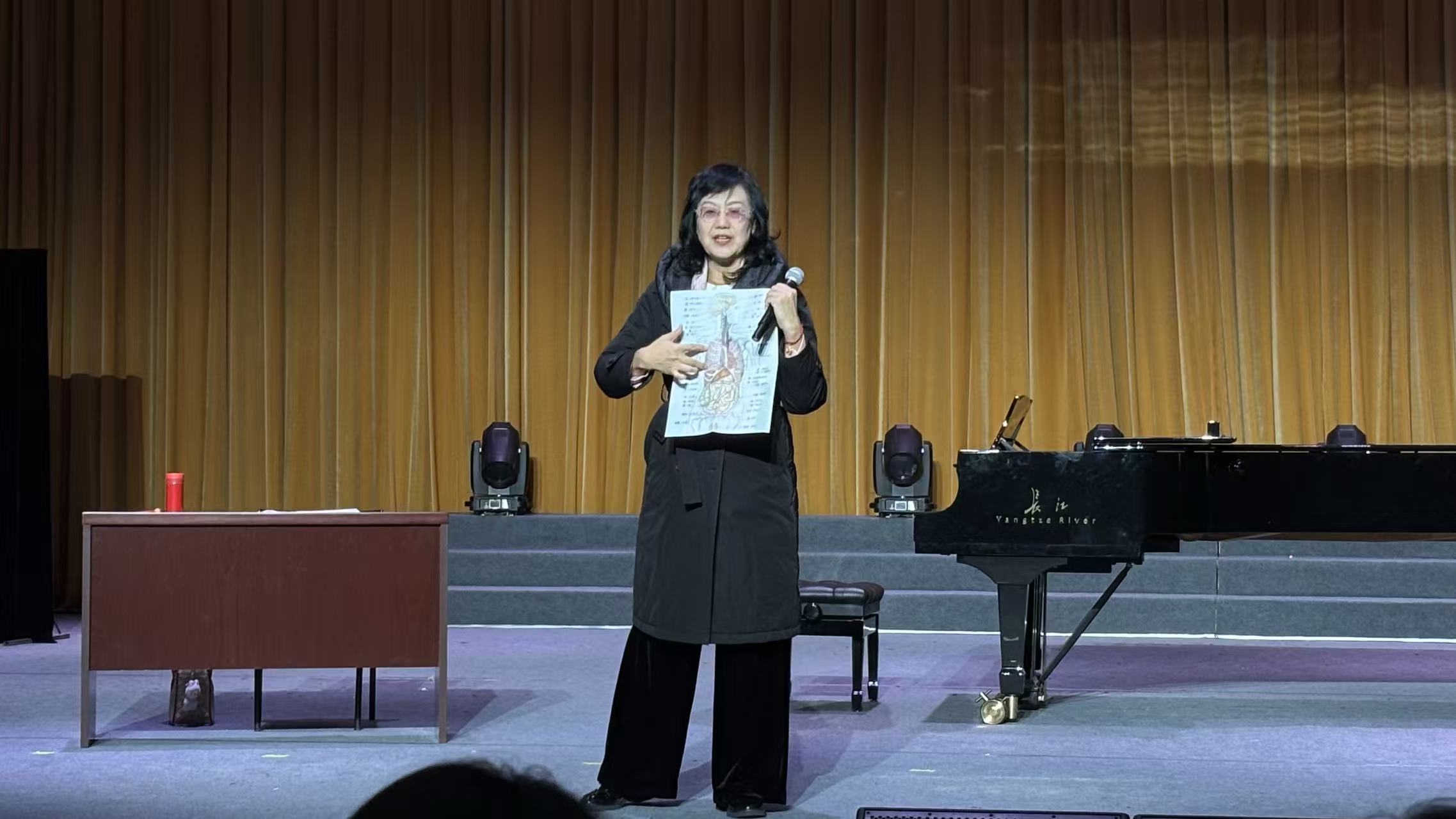 讲座开篇,余惠承教授直指歌唱核心,围绕“气息”这一关键命题展开阐释。针对学生普遍存在的“气吸不到位”“片面理解气沉丹田”等困惑,她结合人体生理结构图示,清晰解析肺部的生理位置与功能,指出吸气过浅、刻意控制气息等常见错误会阻碍科学发声,强调“认真吸气、自然支撑”的重要性。